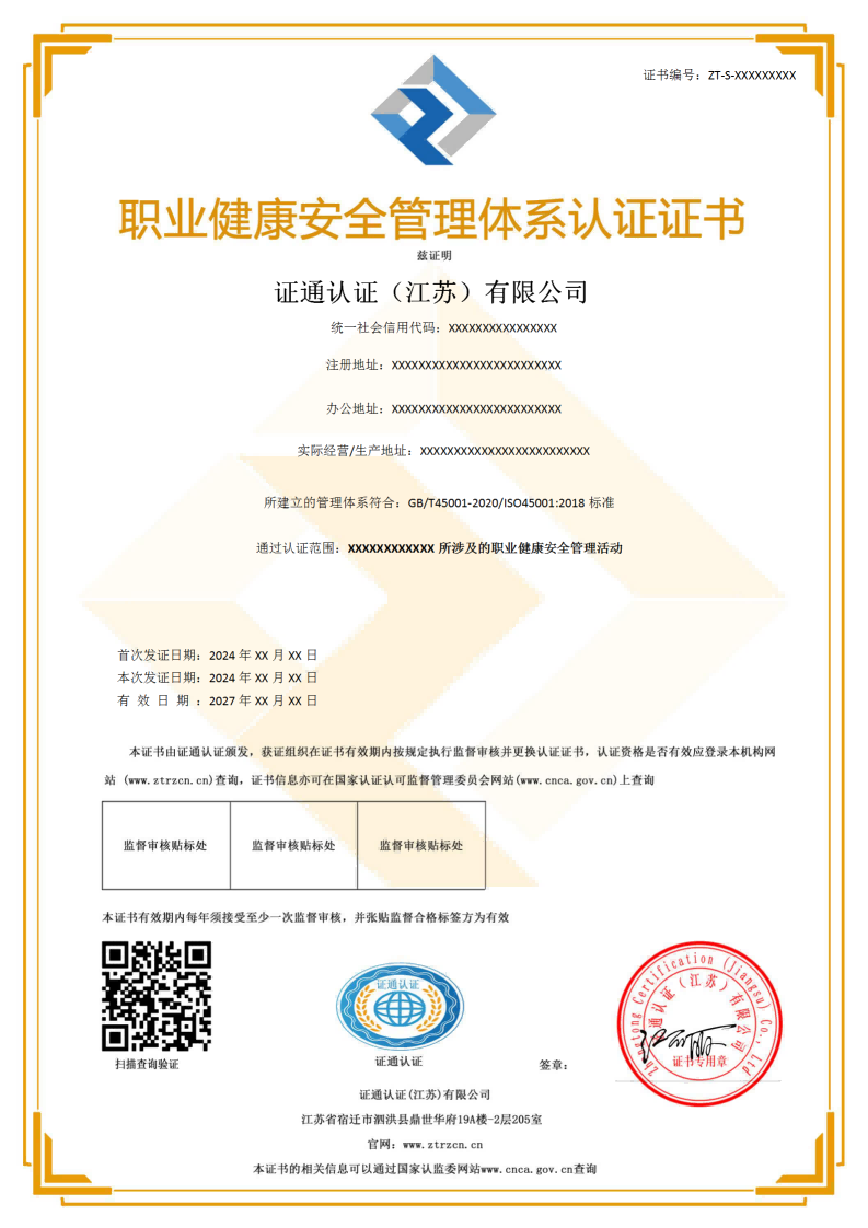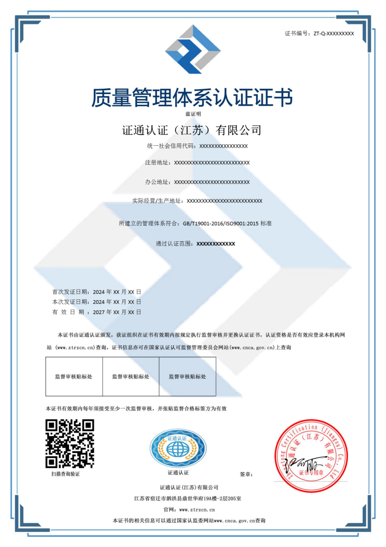 证通认证(江苏)有限公司(ZTRZ)是独立第三方认证机构,开展相关管理体系认证。帮扶企业客户持续提升管理水平和内在价值。本机构在符合相应规范文件要求的同时,具有良好的认证能力和服务水平,可为企业提质增效提供更加适宜和有效的认证评价,带来更多的增值服务。